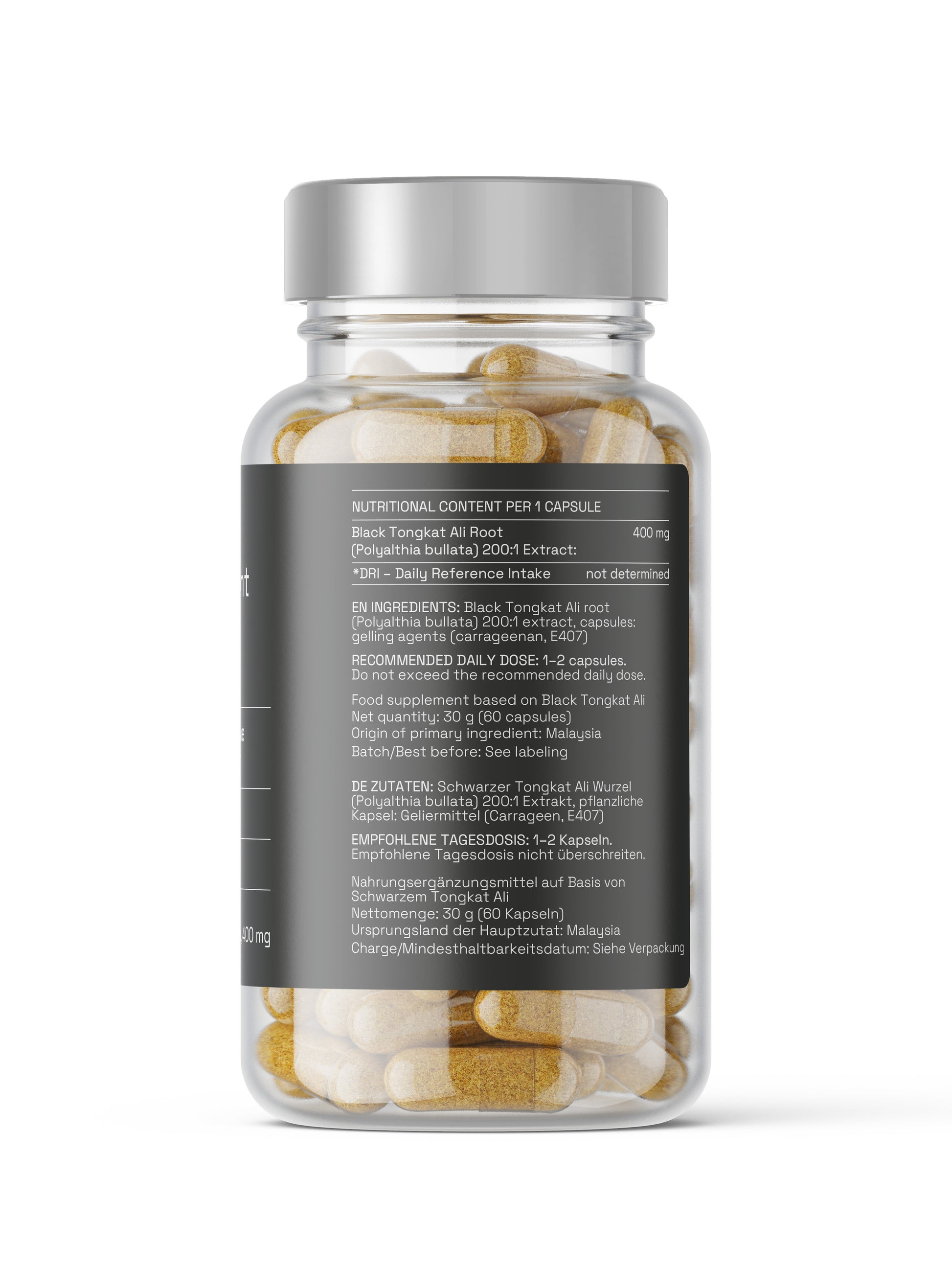 Each capsule contains 400 mg of highly concentrated Black Tongkat Ali extract. No additives. Just pure, powerful Tongkat. 200:1 means that 200 kg of root is used to produce 1 kg of extract.