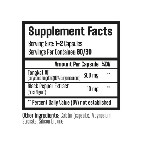 Tongkat Ali is known for its powerful properties as a natural testosterone booster. Our supplement contains 300 mg of pure extract per capsule, enhanced with black pepper for improved absorption. Muscle Rage's Tongkat Ali contains a potent 10% Eurycomanone.